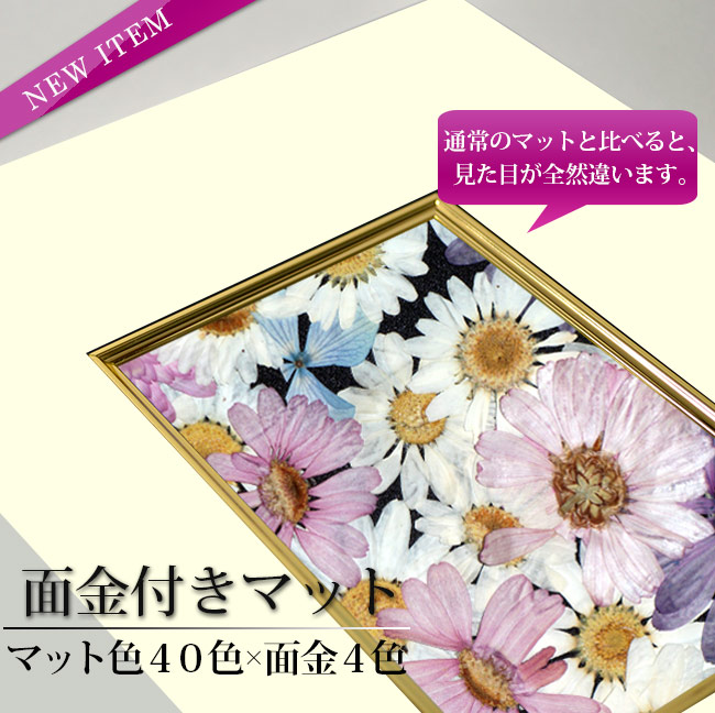 ガラス/アクリルと作品の密着を防ぐ効果もある、当店のおすすめ商品です。面金付きなので、通常のマットと比べてさらに見栄えが良くなります。